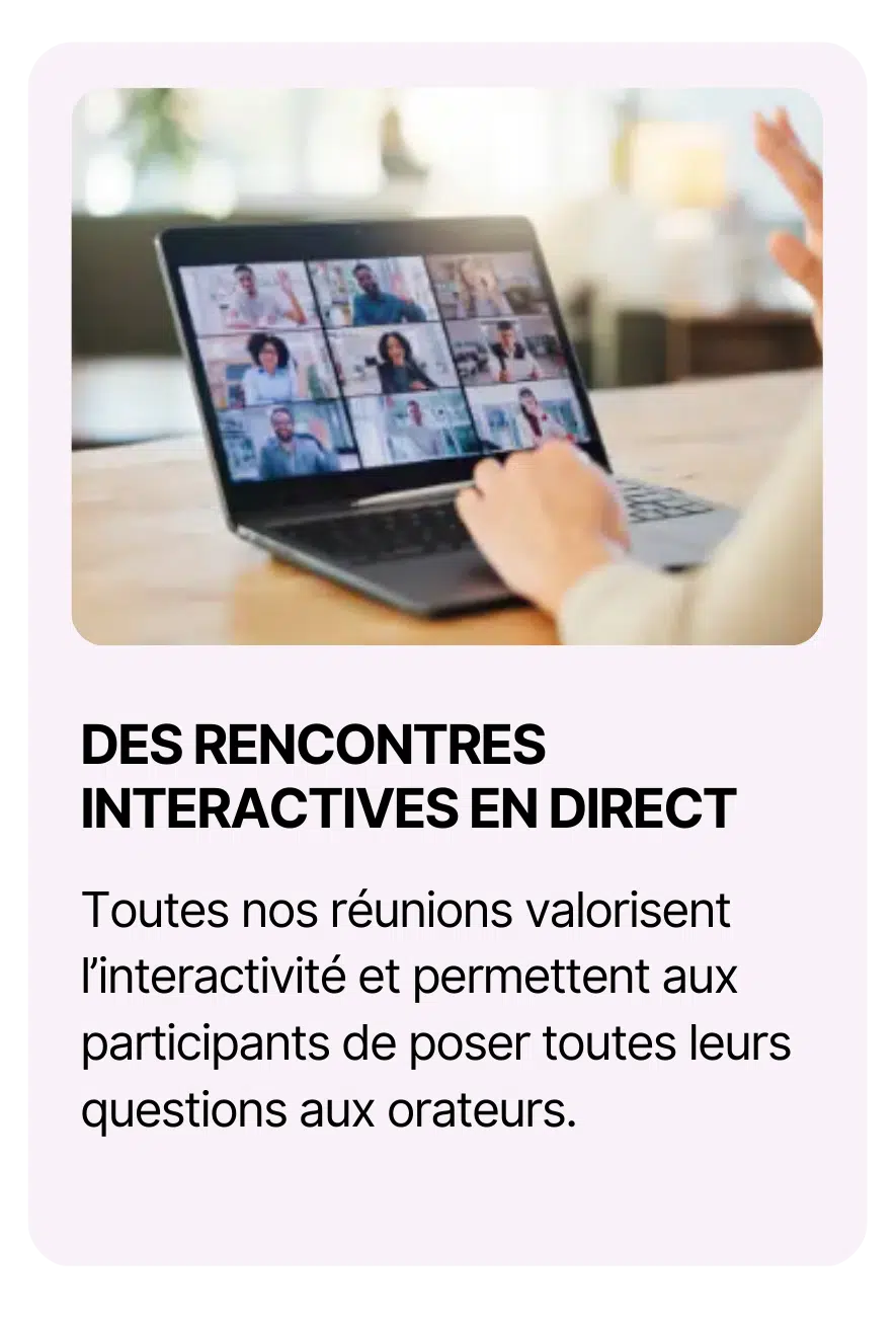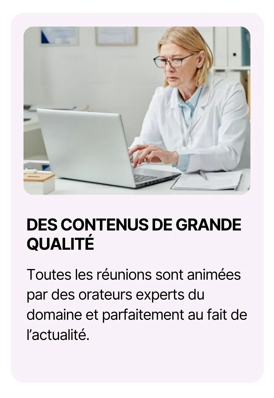 Nous mettons ainsi à votre disposition une information scientifique validée, actualisée et délivrée par des experts de renom. Quel que soit le format de ces réunions (petit comité, webinar, …), elles seront en direct afin de vous permettre de poser toutes vos questions aux intervenants.
